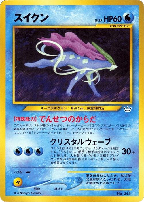 As long as Suicune is your Active Pokémon, Suicune and Energy cards attached to it aren't affected by effects from Trainer cards other than Stadium cards. As long as this Power is active, discard any Trainer cards attached to Suicune. (This power works even if Suicune is Asleep, Confused, or Paralyzed.) - Card Type: Water